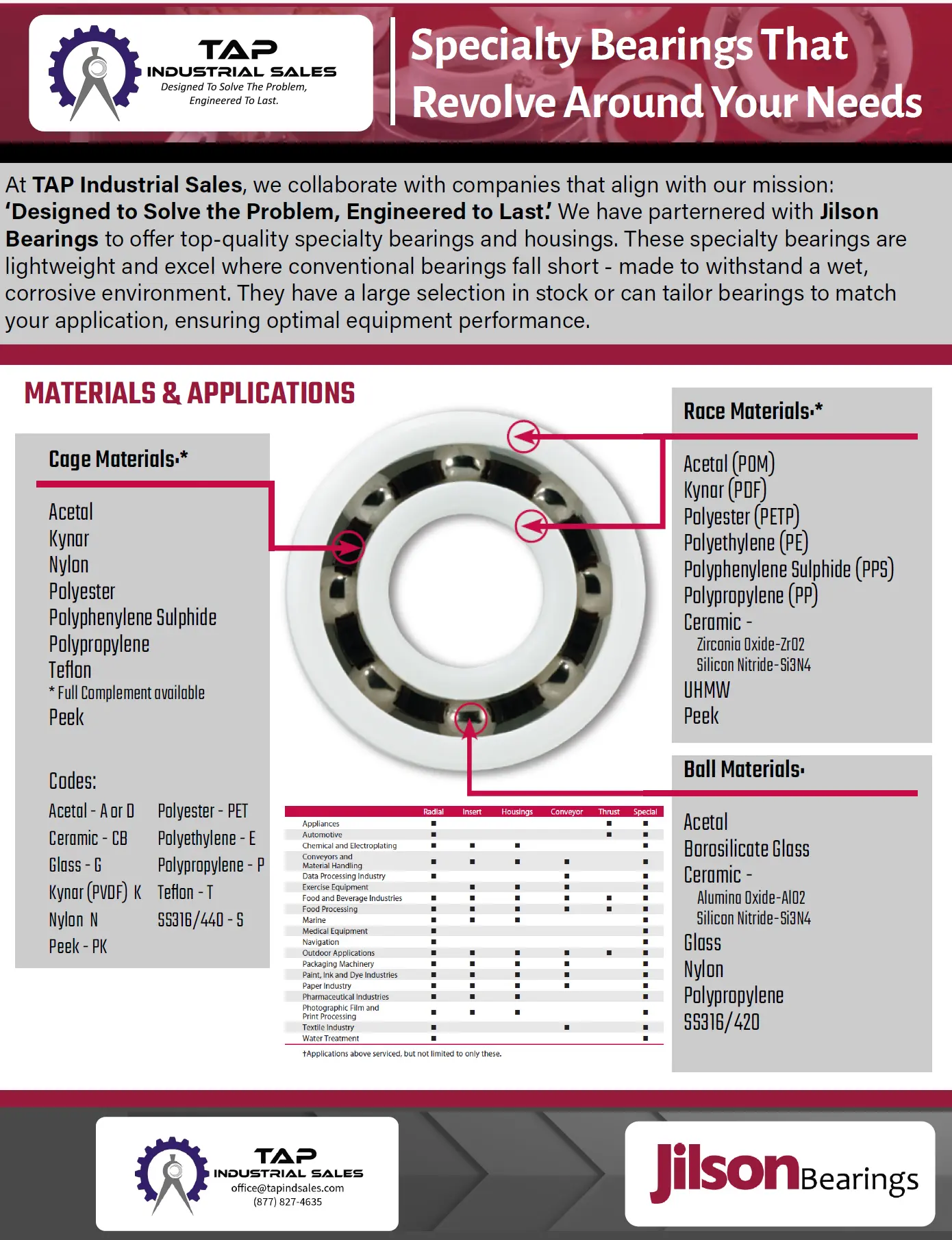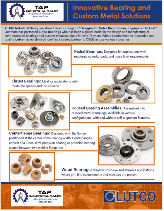 TAP Industrial Sales has partnered with the best Bearing companies in the States as well as around the Globe. Our teams have the best engineering support around and can help you with your bearing questions no matter how hard of a question. Let us help you with your bearing requirements. We have you covered from: A-Z in Bearings.